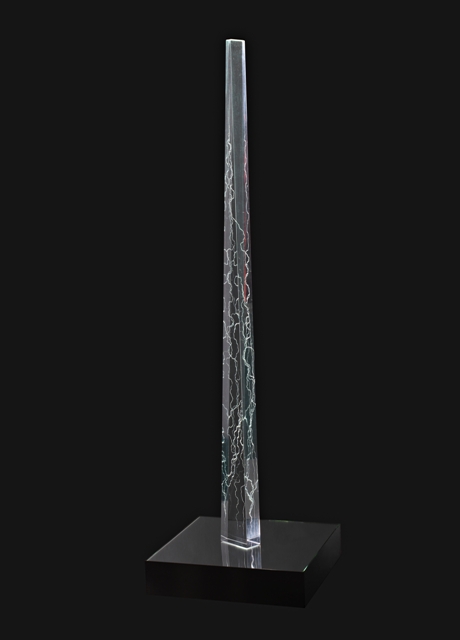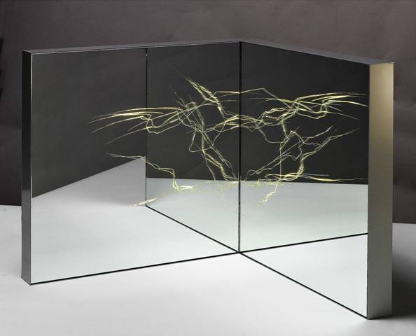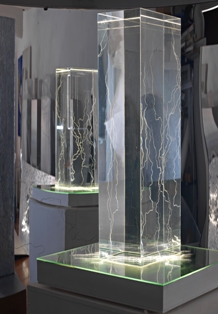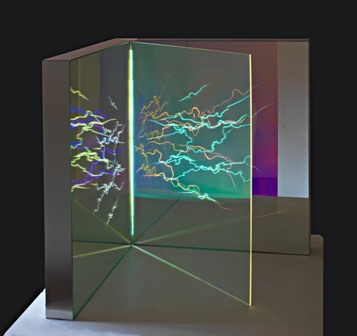 Non è altro che la luce, vera generatrice, fondamento dell’essere, che attraverso il confronto massa/energia, si risolve alla rappresentazione della dinamica  delle linee luminose proiettate. In un continuum infinito di fasci luminosi, s’innalzano anime vive: contenitori dinamici di processi cosmici.