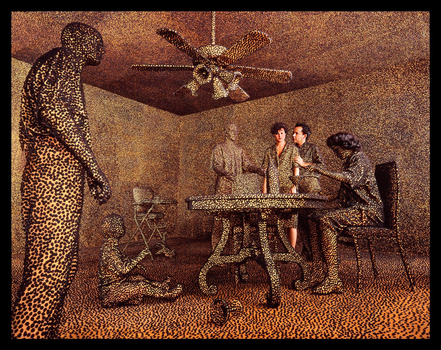 L’ossessione della moda e dell’apparire si trasforma in un ambiente dai colori accecanti il cui unico oggetto ripetuto continuamente è la gruccia per gli abiti; la mondanità di un party fa sì che i suoi partecipanti siano esseri antropomorfi ricoperti dalla testa ai piedi di pop-corn e patatine; nelle tipiche villette a schiera tutte uguali si muovono indisturbati scoiattoli viola e corvi neri tra l’indifferenza di scialbi abitanti; un ordinario interno d’ufficio viene sommerso da improbabili foglie azzurre mentre gatti verdi radioattivi invadono le strade delle grandi città. L’artista crea l’inautenticità della situazione e la normalità diviene una a-normalità accettata con tranquillità: tutto è vero e tutto è falso.
