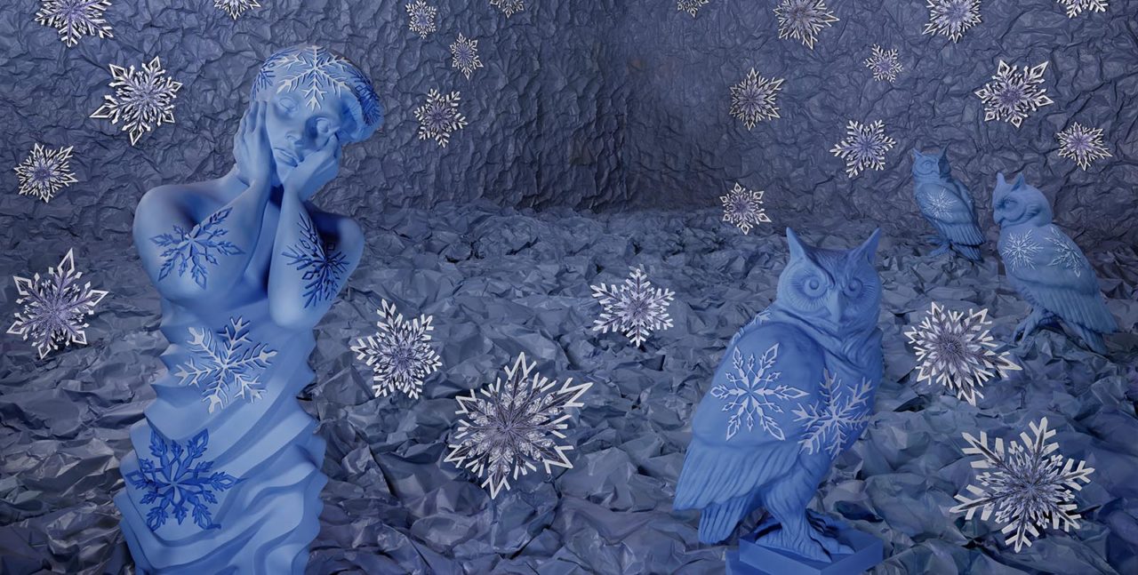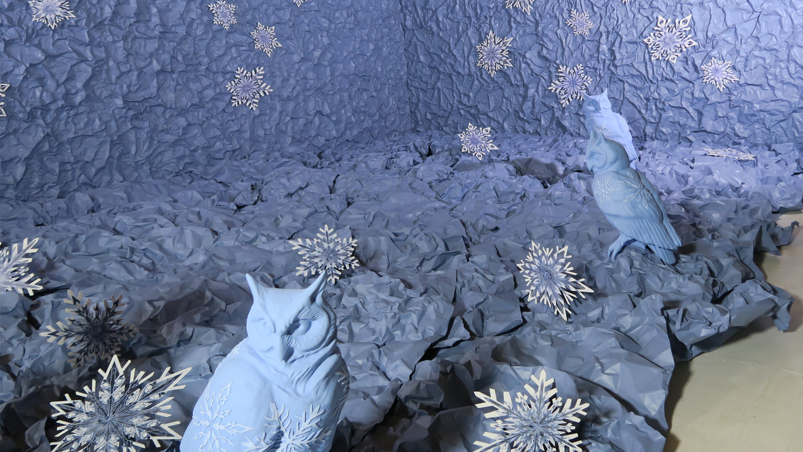 Dal 2004 infatti Sandy lavora ad una serie costituita da quattro paesaggi artificiali “The Four Seasons”, ciascuno riguardante le influenze psicologiche derivanti da ognuna delle stagioni. Dopo la Primavera, ritratta nell’opera “Fresh Hybrid”, “Winter” ne rappresenta la continuazione, proponendo una visione unica della stagione invernale, popolata da sculture di gufi e fiocchi di neve, denominati Eyeflakes. Iniziato nel 2008 e cristallizzato nella macchina fotografica il 22 Dicembre 2018, Winter è ora pronto per essere mostrato al grande pubblico.
